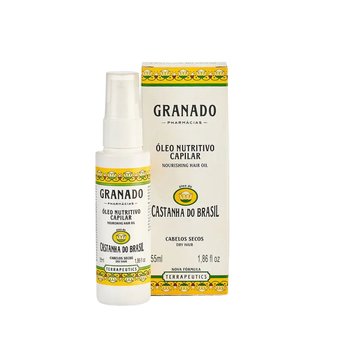Óleo Nutritivo Capilar Granado Castanha do Brasil 55ml nutre e hidrata intensamente os fios, reparando pontas duplas sem pesar.